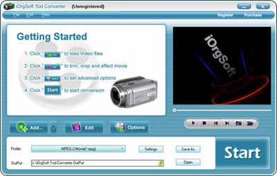 iOrgSoft Tod Converter for Windows - chương trình tiện ích hệ thống với công dụng chuyển đổi dịnh dạng media, ở đây là định dạng TOD, 1 chuẩn video độ phân giải cao được tạo ra bởi các thiết bị thu hình JVC TOD Camcorders như GZ-HD7, GZ-HD3, GZ-HD5, GZ-HD6, GZ-HD30, GZ-HD40...