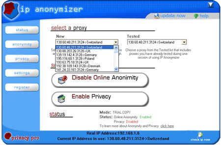 IP Anonymizer 3.5 là một công cụ bảo vệ sự riêng tư để giấu địa chỉ IP máy tính của bạn, ngăn chặn những thói quen lướt web và hoạt động internet qua hình thức Internet được theo dõi bởi các trang web hoặc cung cấp dịch vụ Internet.