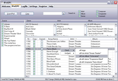 iPod2PC cho phép bạn quản lý, sắp xếp các tập tin nhạc hay chức năng tìm kiếm đa năng bằng tên bài hát, nhạc sĩ, ca sĩ, album … iPod2PC thực hiện việc dò tìm các bài nhạc khi bạn chỉ định thư mục, và hiển thị danh sách cũng như thông tin chi tiết về tất cả tập tin nhạc trong đó. Bạn chỉ cần đánh dấu chọn vào bài nhạc muốn copy hay tất cả các bài nhạc từ một nhạc sĩ, một album nào đó … sau đó chọn thư mục muốn copy đến, iPod2PC sẽ chuyển các bài nhạc này vào nơi chỉ định dễ dàng.