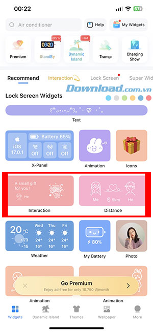 Bước 1: Tải xuống ứng dụng iScreen và khởi chạy. Sau đó chọn Interaction hoặc Distance trong Lock Screen Widgets ở tab Widgets.