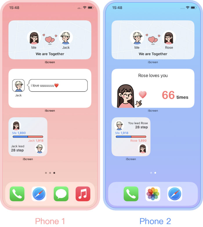 Với Friends Widgets trong iScreen, người dùng có thể tạo widget tương tác trực tiếp để chia sẻ trạng thái, tâm trạng, khoảng cách với bạn bè hoặc người yêu của mình. Mọi người có thể gửi các hoạt ảnh ngọt ngào dành cho người yêu và bạn bè, chia sẻ trạng thái, hoạt động và tin nhắn cho nhau, đồng thời xem khoảng cách theo thời gian thực.