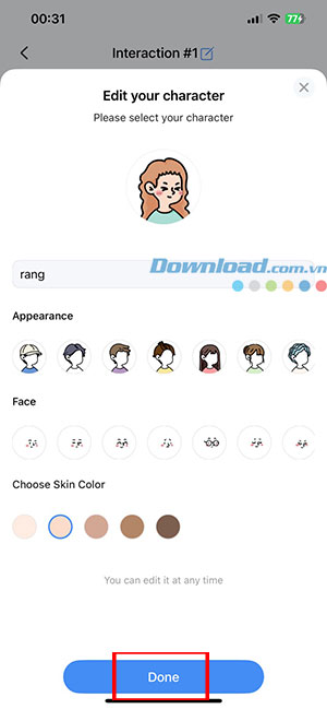 Bước 2: Chỉnh sửa nhân vật của mình, bao gồm tên ngoại hình, gương mặt và màu da. Khi hoàn tất, hãy nhấn nút Done.