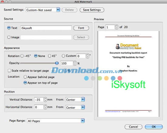 Để sử dụng những công cụ này, hãy truy cập vào submenu Document->Watermark, lựa chọn Add Watermark, Update Watermark hoặc Remove Watermark, và sau đó thực hiện các bước hướng dẫn trên màn hình để chỉnh sửa hình mờ. Bạn cũng có thể sửa dụng cả hình mờ văn bản và ảnh trong iSkysoft PDF Editor for Mac.