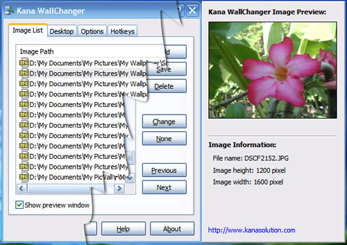 Giao diện đơn giản và dễ dàng sử dụng. Kana WallChanger 2.3.5.41 sẽ hiển thị các hình ảnh ngẫu nhiên trong danh sách, bạn có thể kéo và thả tập tin hình ảnh vào danh sách. Công cụ có 4 thẻ chính với các chức năng như sau: