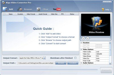 Kigo Video Converter Pro là phần mềm chuyển đổi video toàn diện dành cho thiết bị iPhone, iPod, PSP,... Kigo Video Converter for Win có thể chuyển đổi các định dạng video từ định dạng này sang định dạng khác với chất lượng đầu ra tuyệt vời cùng tốc độ thực hiện nhanh. Phần mềm này hỗ trợ tất cả các định dạng video phổ biến như flv, MPEG1, MPEG2, MP4, 3GP, 3G2, MOV, AVI, M2TS, MPEG TS/TP (for HD Video), M4V,... Bên cạnh đó, phần mềm chuyển đổi này cũng cung cấp chức năng chuyển đổi video sang audio, audio sang audio. Định dạng audio được hỗ trợ bao gồm MP3 và AAC. Kigo Video Converter hoạt động tốt với tất cả các thiết bị chạy video như iPod touch, iPod classic, iPod nano, iPhone, Apple TV, PSP, PS3, Creative Zen, iRiver PMP, Archos,...