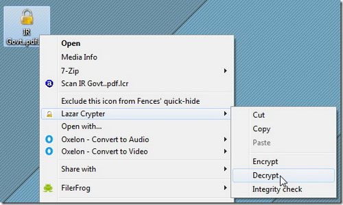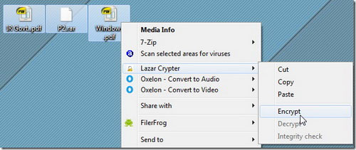 Sau khi tiến hành cài đặt vào hệ thống, người dùng chỉ cần kích chuột phải vào file mà mình muốn mã hóa trong menu Lazar Crypter rồi chọn Encrypt. Người dùng cũng có thể chọn nhiều file để mã hóa cùng một lúc dưới một mật khẩu bảo vệ duy nhất.