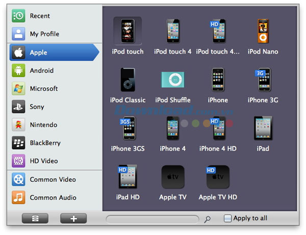 Nhấn nút biểu tượng trước nút 3D trên mỗi tiêu đề DVD để truy cập bảng thiết lập cấu hình. Ở đó, bạn có thể lựa chọn một định dạng đầu ra phù hợp để chuyển đổi DVD sang video trên Mac. Lựa chọn một định dạng theo thiết bị đầu ra hoặc trình phát có sẵn.