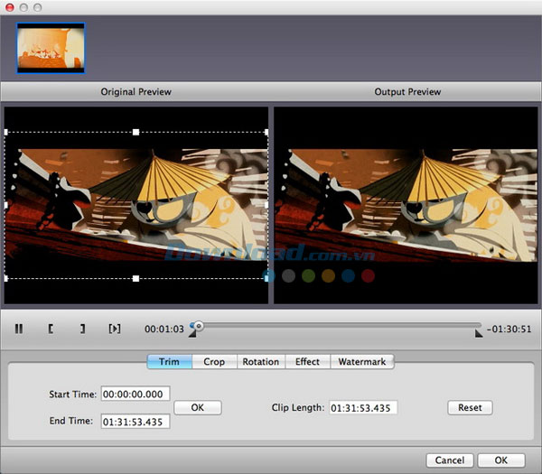 Trong phần Trim, bạn có thể chia tách video DVD hoặc nhận được phân đoạn mong muốn từ nguồn DVD bằng cách thiết lập giá trị trong khung Start Time và End Time trong khi phát video DVD.