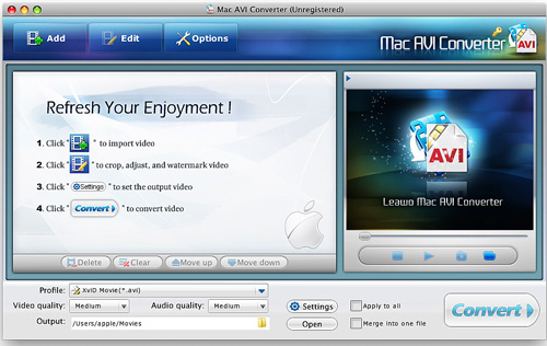 Là một phần mềm chuyển đổi video AVI mạnh mẽ dành cho Mac, Leawo Mac AVI Converter có thể chuyển đổi AVI từ tất cả các định dạng video phổ biến, ví như Mac MP4 sang AVI, Mac MOV sang AVI, Mac WMV sang AVI, Mac MPEG sang AVI, Mac MKV sang AVI,... Thêm vào đó, phần mềm này còn hỗ trợ trích xuất audio track từ các file video để lưu lại theo định dạng Mp3, AAC,...