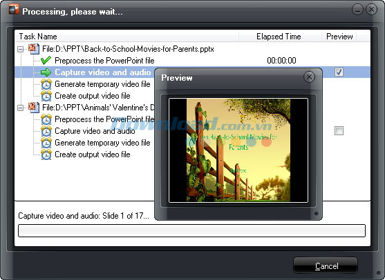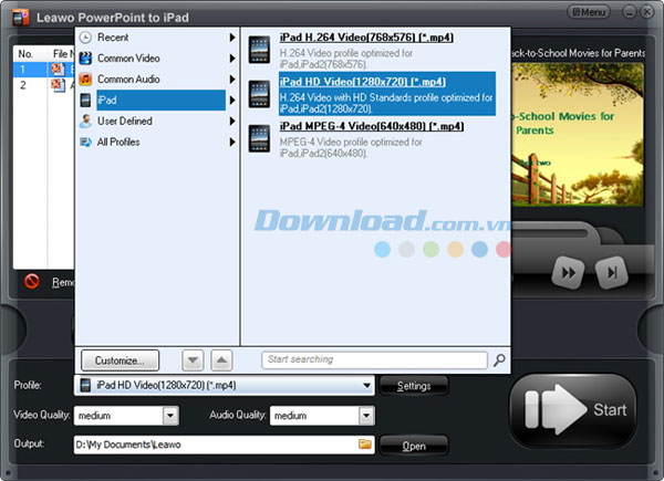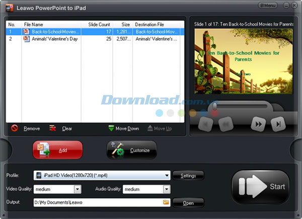 Bạn có thể thêm một vài tập tin PPT cùng một lúc và mỗi cái sẽ được chuyển đổi sang định dạng video tương thích với iPad. Tính năng hữu ích này sẽ mang lại cho bạn nhiều điều thuận tiện hơn và tiết kiệm đáng kể thời gian phải bỏ ra để chuyển đổi PPT sang iPad. Xem trước tập tin video trong thời gian thực để bạn có thể thưởng thức chúng nhanh chóng.