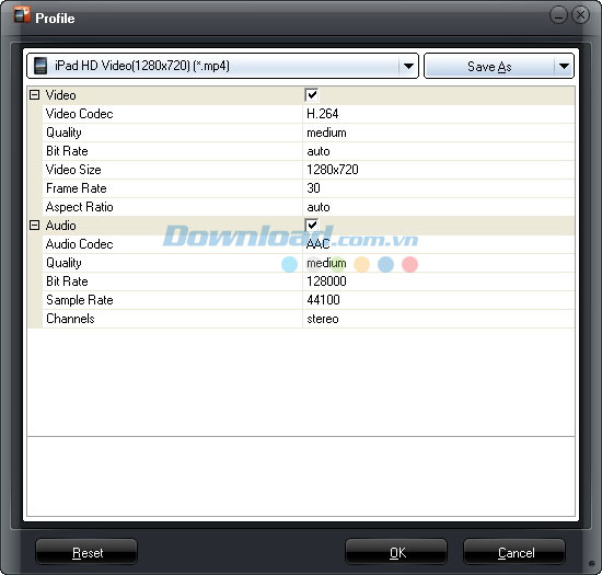 Giờ đây, người dùng được phép thoải mái chỉnh sửa một vài thông số đầu ra cho video và audio, chẳng hạn như: codec, tốc độ bit, kích thước và tỷ lệ video, tốc độ khung hình, kênh, vv. Nhấn nút "Settings" để chỉnh sửa như bạn muốn và "Save As" để lưu lại thiết lập riêng của mình dưới dạng cấu hình video mới nhằm phục vụ mục đích sử dụng sau này.