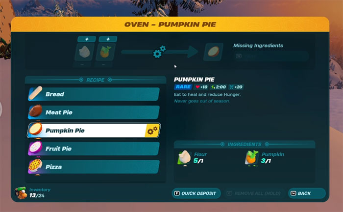 | Pumpkin Pie | Oven, 1 Pumpkin, 1 Flour | +10 Heart, +20 Hunger, +2 phút phục hồi Stamina |