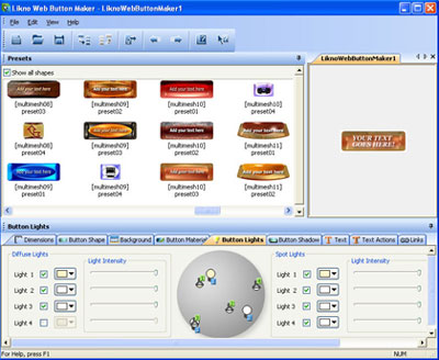 Likno Web Button Maker dùng tạo button 3D cho trang web với nhiều kiểu mẫu đẹp, cho phép thay đổi background, thêm text, hiệu ứng và xuất ra hàng loạt các button cho thanh navigate bar.