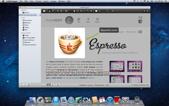 Từ bộ công cụ chụp toàn diện cho desktop và web, các tùy chọn tổ chức cho thư viện, và vector cơ sở thông qua Ember Flickr và chia sẻ SFTP, LittleSnapper có đầy đủ công cụ mà một nhà thiết kế cần để quản lý thư viện thiết kế của riêng mình.