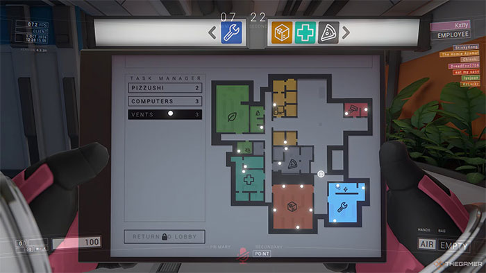 Người chơi sẽ biết có bao nhiêu lỗ thông hơi cần sửa bằng số được chỉ định bên cạnh tiêu đề Vent trong trình quản lý tác vụ. Để sửa các lỗ thông hơi, mọi người sẽ cần một tua vít. Thông thường, hầu hết các công cụ sẽ được tìm thấy trong phòng chứa đồ được đánh dấu bằng hộp màu cam trên bản đồ. Lấy một tua vít và đi đến các lỗ thông hơi.