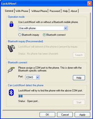 - Tab General: Để bạn cấu hình sử dụng chương trình. Bạn bấm chọn Use with phone trong mục Operation mode để chương trình cho bạn lock máy tính thông qua mobile phone. Bạn phải kết nối máy mobile của mình thông qua cổng “Bluetooth”. Tuy nhiên, nếu bạn không có mobile thì chương trình cũng cho bạn lock máy tính nhanh chóng với tác vụ Use Without phone trong mục Operation mode.