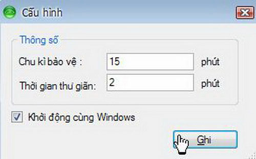 Sau khi tải về và chạy phần mềm, nhấp phải vào icon trên System tray, chọn Cấu hình để thiết lập thời gian chu kỳ bảo vệ và thư giãn mắt, bật khởi động cùng Windows, rồi nhấp Ghi để lưu thiết lập.
