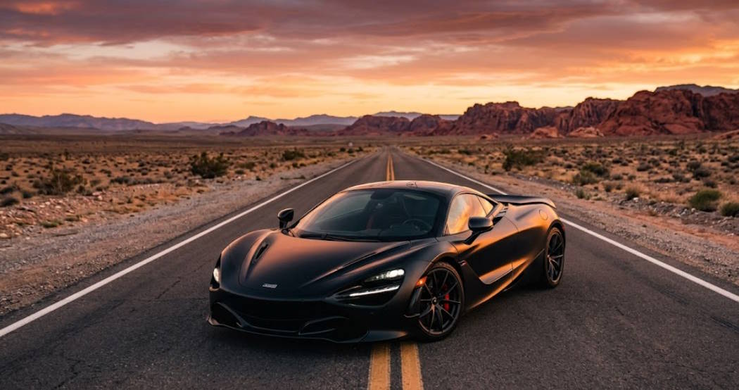 Hãy tạo bức ảnh về một chiếc xe thể thao màu đen mờ bóng bẩy đậu giữa vạch kẻ đường của một con đường cao tốc sa mạc hai làn vắng vẻ vào giờ vàng. Chiếc xe được đặt ở góc ba phần tư phía trước, hơi quay về phía máy ảnh. Nắp ca-pô và đường mái xe phản chiếu ánh sáng hổ phách ấm áp từ mặt trời lặn. Phông nền là một vùng sa mạc rộng lớn, bằng phẳng trải dài đến tận chân trời với những khối đá đỏ ở xa và bầu trời đầy những sắc thái cam, hồng và tím đậm. Con đường mờ dần và biến mất phía sau chiếc xe. Máy ảnh được đặt thấp ở độ cao ngang cản xe, chụp hơi hướng lên trên để làm cho chiếc xe trông nổi bật và mạnh mẽ. Chỉnh màu điện ảnh ấm áp với bóng đổ đậm và điểm nhấn vàng. Chụp bằng ống kính 35mm, độ sâu trường ảnh rộng. Sử dụng tỷ lệ khung hình 16:9.