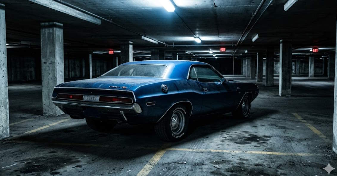 Hãy chụp một bức ảnh chiếc xe cơ bắp Mỹ màu xanh nửa đêm đậu trong bãi đỗ xe ngầm bằng bê tông thiếu sáng, ở góc nhìn ba phần tư phía sau. Dáng xe rộng và vòm bánh sau hầm hố nổi bật. Đèn huỳnh quang trên trần chiếu ánh sáng trắng xanh gay gắt lên nắp ca-pô và nóc xe, tạo ra những bóng đổ mạnh mẽ bên dưới xe. Sàn bê tông có vết dầu loang và vạch kẻ đường. Bối cảnh bao gồm những hàng cột bê tông mờ dần vào bóng tối với một vài biển báo lối ra ở xa. Chúng phát sáng màu đỏ. Máy ảnh được đặt ngang đầu gối, chụp lên trên với một góc hơi nghiêng. Chỉnh màu thô ráp, giảm độ bão hòa với tông màu lạnh và độ tương phản cao. Chụp bằng ống kính 35mm, lấy nét sắc nét xuyên suốt. Sử dụng tỷ lệ khung hình 16:9.