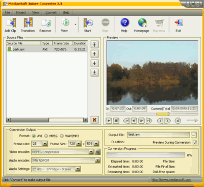 Với giao diện đẹp và dễ dùng, MedianSoft Joiner–Converter cho bạn nối kết các tập tin hình ảnh (bmp, jpg...), video (mpeg, wmv...) và audio (mp3, wav, asf) thành một tập tin video kèm theo hiệu ứng đẹp cho việc hiển thị.