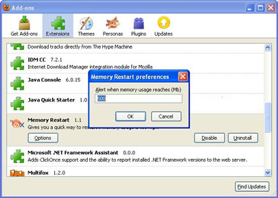 Để thay đổi ngưỡng bộ nhớ Firefox chiếm dụng mà Memory Restart sẽ đưa ra cảnh báo, bạn vào menu Tools > Add-ons, rê chuột vào biểu tượng Memory Restart, bấm nút Options, nhập giá trị mới vào hộp Memory Restart preferences tùy thuộc vào bộ nhớ RAM của máy tính, rồi bấm OK để xác nhận.