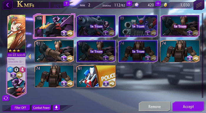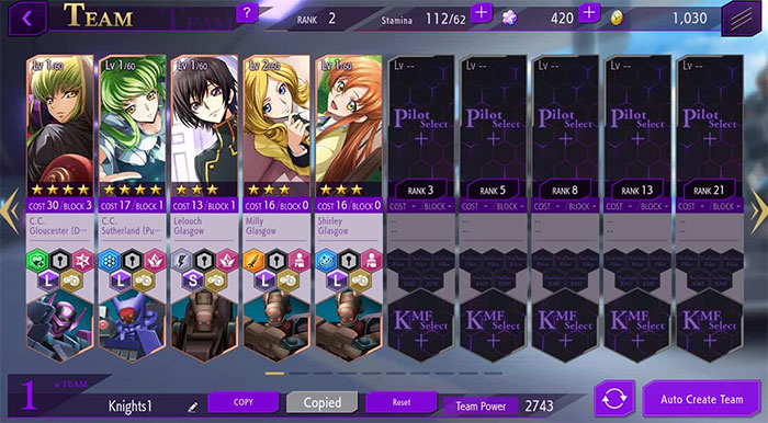 Khi tập hợp nhóm, người chơi nên xem xét sức mạnh tổng hợp giữa các Pilot và Knightmare Frame (KMF) được chỉ định của họ. Mỗi Pilot có một vai trò và bộ khả năng riêng biệt, vì vậy việc kết hợp họ với KMF để bổ sung cho điểm mạnh là rất quan trọng.
