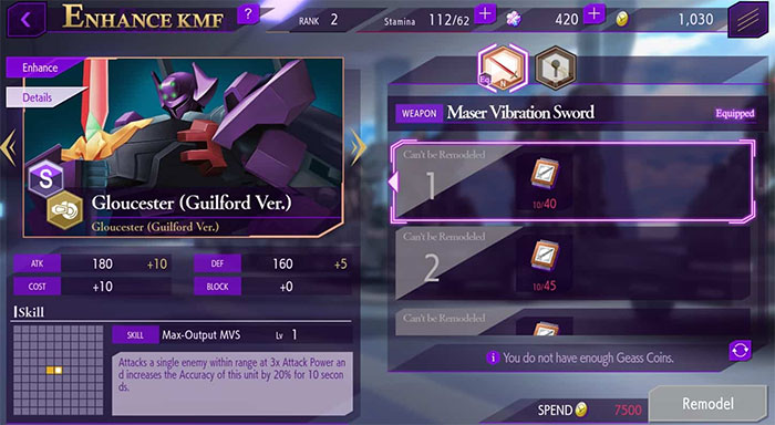 Nếu có một Pilot chuyên tấn công tầm xa, việc giao cho họ một KMF có khả năng tấn công tầm xa vượt trội là điều hợp lý. Sức mạnh tổng hợp này có thể tối đa hóa hiệu quả của đội trong các trận chiến, chẳng hạn như ghép đôi Pilot bắn tỉa lành nghề với tay bắn tỉa có độ chính xác cao KMF.