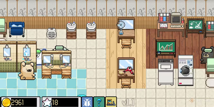 Animal Spa không có tường ngăn, nên mỗi tầng chỉ là một không gian mở rộng dài. Rất may là game cung cấp nhiều lựa chọn hoa văn sàn nhà để người chơi phân chia khu vực. Ví dụ, mọi người có thể tạo lối đi bằng sàn gỗ, còn khu tắm thì dùng gạch hoặc đá.