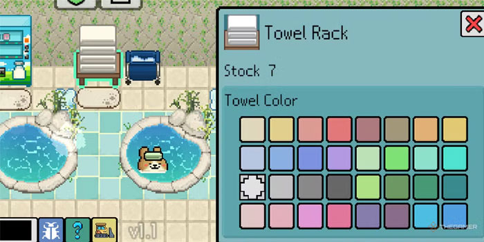 Để hạn chế việc này, hãy đặt nhiều giá khăn gần khu tắm. Đừng quên đặt thùng thu khăn đã dùng Towel Collection Bin ở gần để khách có thể hoàn khăn sau khi dùng. Ngoài ra, người chơi còn có thể thay đổi màu khăn và khách sẽ đội khăn lên đầu rất dễ thương.