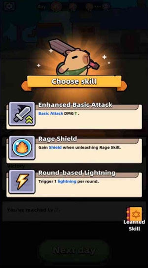 Khi đang ở giữa cuộc phiêu lưu Capybara Go và lên cấp bằng cách kiếm EXP thông qua việc giành chiến thắng trong trận đấu, trò chơi sẽ cho game thủ cơ hội chọn các kỹ năng đặc biệt cho nhân vật.