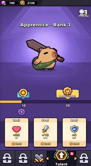 Không giống như việc chọn các kỹ năng trong cuộc phiêu lưu, các nâng cấp tài năng này có hiệu lực trong toàn bộ thời gian. Vì vậy, game thủ nên nâng cấp tài năng của mình bằng cách chi các tài nguyên có liên quan và đây là một trong những chiến lược chính sẽ giúp thành công trong Capybara Go.