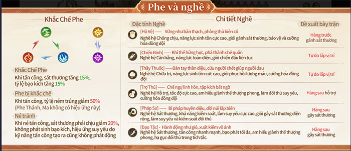 Người chơi cần chiêu mộ các tiên nhân sở hữu những kỹ năng riêng biệt cho đội hình chiến đấu của mình. Các nhân vật đều thuộc những hệ và phe khác nhau, với cơ chế khắc chế lẫn nhau, đòi hỏi người chơi cần sắp xếp một cách hợp lý. Các nhân vật trong trò chơi được chia thành nhiều nghề với đặc tính khác nhau, bao gồm Hộ Vệ, Chiến Binh, Thầy Thuốc, Trợ Thủ, Pháp Sư và Đạo Tặc.