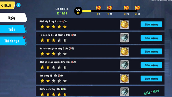 Loạn Đấu Manga có hệ thống nhiệm vụ chia thành 2 loại là nhiệm vụ ngày (được làm mới mỗi ngày) và nhiệm vụ tuần (làm mới hằng tuần). Bằng cách hoàn thành nhiệm vụ, người chơi sẽ nhận được phần thưởng tích lũy và số sao tương ứng. Khi người chơi đạt mốc sao nhất định sẽ nhận thêm thưởng tương ứng với mốc sao đó.