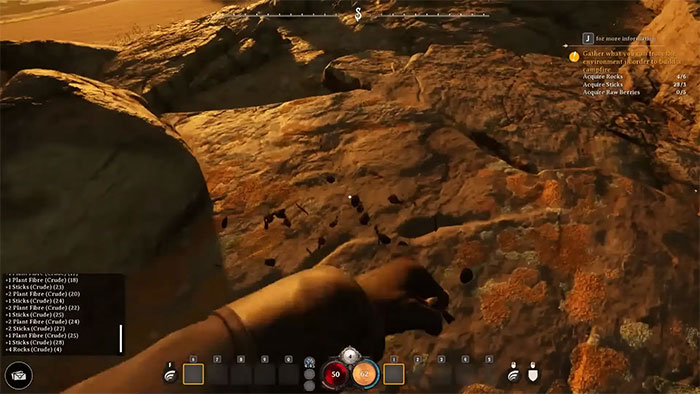 Khi mới bắt đầu trò chơi, người chơi chắc chắn sẽ không có thứ gì để mang bên mình. Không có vũ khí, không có thức ăn, không có vật dụng nào khác để giúp sinh tồn. Vậy nên, việc nhặt mọi thứ trong tầm mắt thì điều tân thủ cần làm khi bắt đầu từ con số 0. Thịt, thực vật, quả mọng, gậy, bất cứ thứ gì và mọi thứ đều cần phải được nhặt nếu người chơi muốn sống sót.