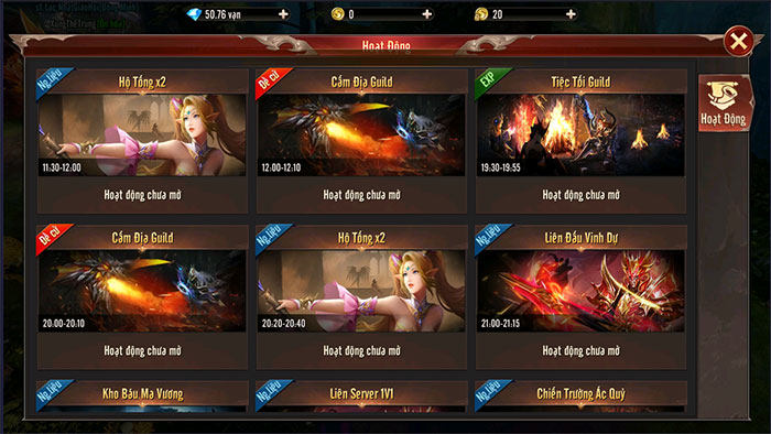 Trò chơi có rất nhiều sự kiện và hoạt động hàng ngày kèm với phó bản và săn boss. Đa số các hoạt động trong game hiện tại là săn boss và PK boss. Việc tham gia đầy đủ những hoạt động này giúp tân thủ farm tài nguyên hiệu quả, giành boss khi boss còn lại khoảng 10% máu.