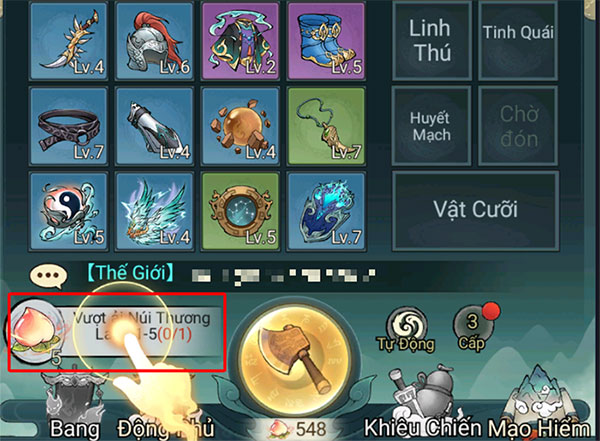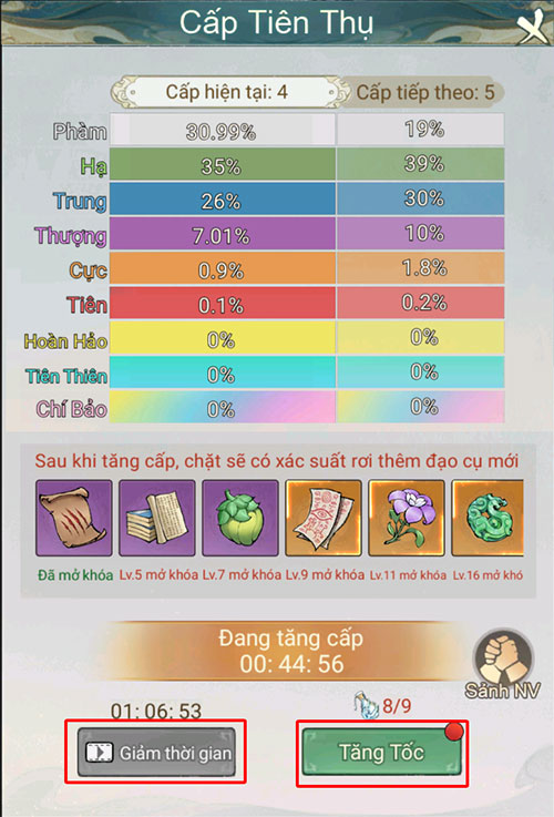 Do đó, càng chặt nhiều cây thì mọi người sẽ càng thu thập được nhiều nguyên liệu nâng cấp tiên thụ. Ngoài ra, game thủ có thể xem quảng cáo để tăng cấp nhanh, dùng Tịnh Bình Thủy để giảm thời gian chờ tăng cấp. Tịnh Bình Thủy có thể nhận được thông qua Mạo hiểm, yêu cầu người chơi tăng cao yêu lực bằng cách chặt cây tìm vật phẩm.