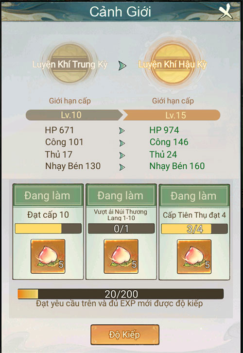 Nhiệm vụ độ kiếp giúp các tiểu yêu quái đột phá cảnh giới nhằm tăng sức mạnh và thể lực. Những nhiệm vụ này cung cấp các cột mốc quan trọng mà game thủ hoàn thành sẽ đảm bảo cân bằng giữa chặt cây tăng tu vi và cấp tiện thụ.