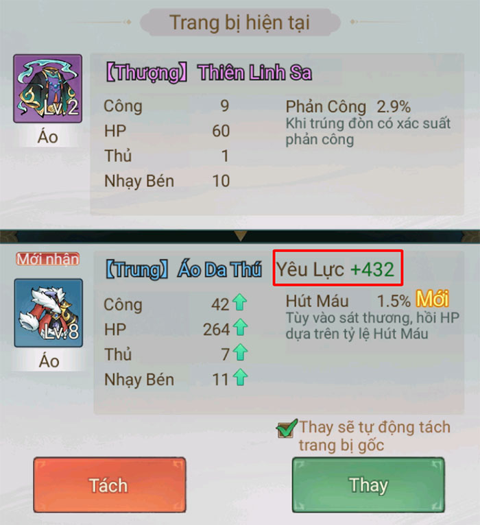 Trang bị được đánh giá là hiệu quả thông qua tổng lượng yêu lực mà nó cộng vào cho tiểu yêu quái, kèm theo cấp độ mà trang bị đó đang được nhận định. Game thủ nên dành thêm thời gian để so sánh chi số và khả năng mà các trang bị đó mang lại cho nhân vật, ví dụ như lợi thế đánh boss, PvP,...