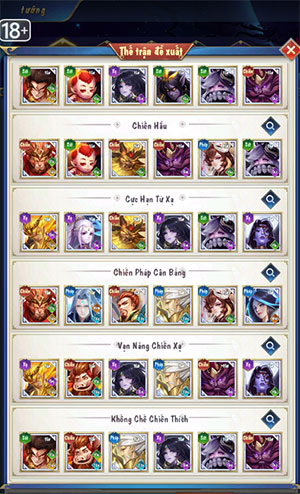 Sau khi có được các nhân vật, một phần rất quan trọng cần làm khác đó là xây dựng đội hình để đi chinh chiến, đánh boss, leo tháp,... Trong giai đoạn đầu game, tân thủ có thể tham khảo đội hình dựng sẵn như Chiến Hầu, Cực Hạn Tứ Xạ, Khống Chế Chiến Thích,...