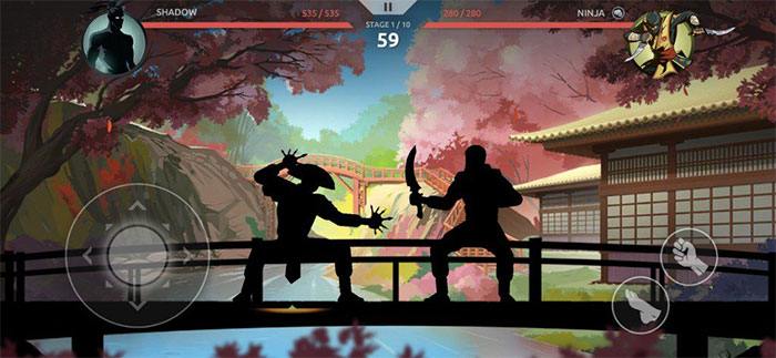 Shadow Fight được biết đến nhiều nhất nhờ hệ thống chiến đấu tuyệt vời. Khi trận chiến bắt đầu, cả người chơi và kẻ thù sẽ được hiển thị với thanh máu ở trên cùng, kèm theo 3 nút trên màn hình.