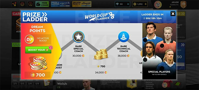 Khi tiếp tục tích lũy DP, người chơi sẽ leo lên Prize Ladder và cuối cùng mở khóa đá quý và tiền xu cùng với 4 Classic Player khác đã góp mặt trong World Cup 98. Mỗi chu kỳ thang giải thưởng kéo dài trong 90 ngày và game thủ có thể mong đợi những Classic Player mới vào cuối mỗi chu kỳ.