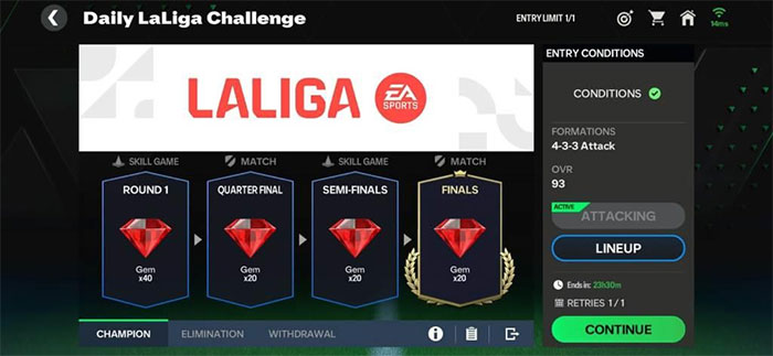 Chế độ Challenge thường xuyên trao một lượng đá quý kha khá khi giành chiến thắng trong các trận đấu kỹ năng và trận đấu PvE dựa trên AI cụ thể. Bên cạnh các chế độ PvP Challenge và dành riêng cho sự kiện, FC Mobile cũng đã giới thiệu chế độ La Liga Challenge hàng ngày và cuối tuần nhằm kỷ niệm sự hợp tác của giải đấu với EA Sports.