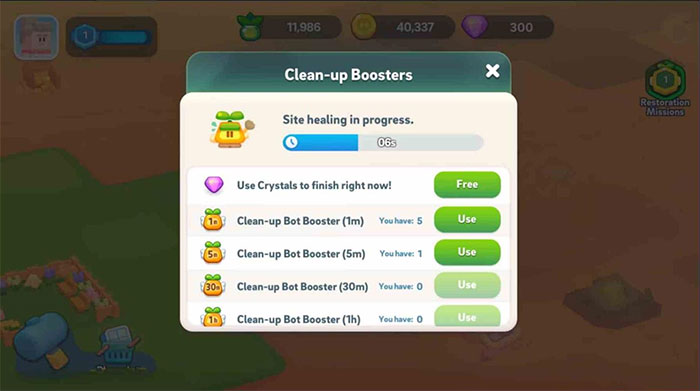 Tại đây, game thủ có thể đợi cho đến khi hết thời gian khôi phục hoặc sử dụng công cụ hỗ trợ dọn dẹp. Các booster dọn dẹp rất hữu ích trong việc giảm thời gian nâng cấp trung tâm phục hồi trái đất. Có các loại tăng cường dọn dẹp với giới hạn thời gian khác nhau và tùy theo thời gian cần thiết để nâng cấp trung tâm phục hồi trái đất, người chơi có thể chọn một booster phù hợp