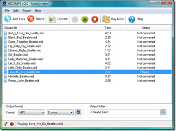 MID2MP3 thực hiện việc chuyển đổi thông minh định dạng MIDI sang MP3, WAV, WMA và cung cấp nhiều thiết đặt sẽ đáp ứng nhu cầu của bạn. Chương trình này có một giao diện gọn gàng và dễ dạng sử dụng mà người mới dùng cũng có thể hiểu được. Trình chuyển đổi MIDI này không những cho phép bạn chuyển đổi file MIDI mà còn phát lại trực tiếp các file MIDI ngay trên chương trình.