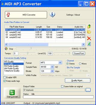 MIDI MP3 Converter là công cụ có ích giúp bạn chuyển đổi MIDI files sang định dạng MP3, WAV, WMA, OGG, FLAC, MPC, APE files.