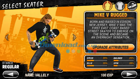 Chọn giữa 8 nhân vật và tùy biến từng nhân vật cho phù hợp với sở thích của bạn bằng các thông số độc đáo. Từ trang phục cho tới giày và hệ thống thiết lập yêu thích. Thỏa sức lựa chọn các loại ván trượt, xe tải và bánh xe, bao gồm các vật phẩm từ Airwalk, Powell & Peralta, Bones, Tork Trux và Iron Fist Clothing.
