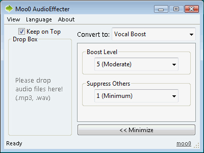 Moo0 AudioEffecter là tiện ích miễn phí, có khả năng vừa nâng cao chất lượng âm thanh vừa áp dụng một số hiệu ứng đặc biệt cho các file nhạc. Tất cả được thực hiện rất đơn giản bằng thao tác kéo thả file nhạc vào giao diện chương trình.