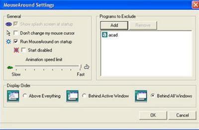 Bạn cũng có thể vào “Settings” để thực hiện một số tinh chỉnh như: tốc độ nhanh chậm của hiệu ứng, kiểu thể hiện trong Windows, quy định những ứng dụng không cần đến MouseAround...