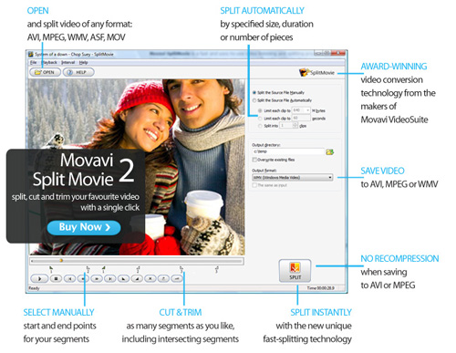 Movavi SplitMovie là phần mềm chia và cắt video nhanh chóng và rất dễ sử dụng. Cắt và lưu lại các phần yêu thích của bạn từ một bộ phim hoặc chia một file lớn thành các phần độc lập nhỏ hơn để ghi ra đĩa Cd hoặc DVD.