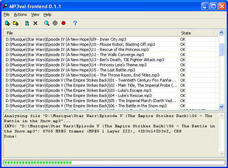 Sau khi đã liệt kê những tập tin mp3 mắc lỗi vào trong danh sách cần khôi phục của chương trình, bạn truy cập vào menu Actions, chọn Scan all để nhờ chương trình kiểm tra xem có bị lỗi hay không. Nếu tập tin còn sử dụng bình thường bạn sẽ nhận được thông báo OK trong cột State cạnh tên tập tin liệt kê, và ngược lại nghĩa là tập tin mp3 của bạn đã bị dính lỗi cần phải khôi phục lại.